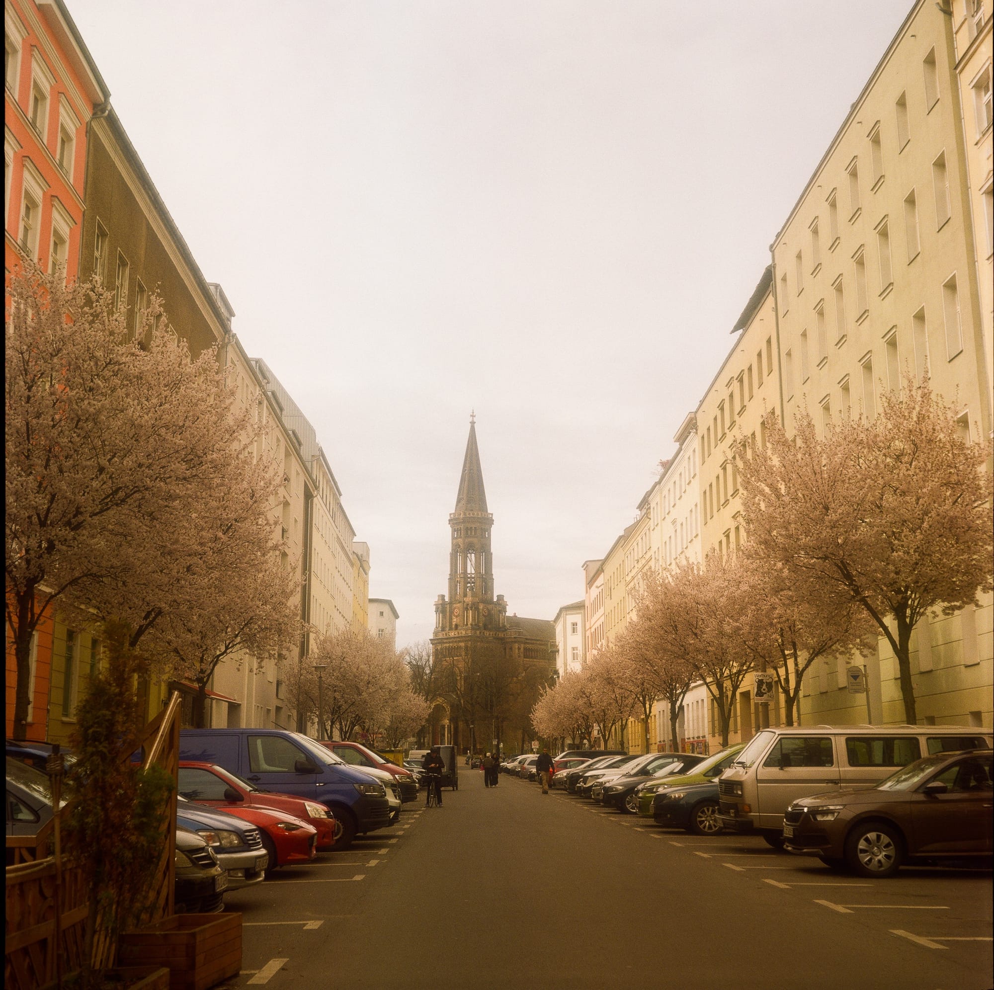 Зарядил катушку Kodak Gold и отснял уже в Берлине. Как и на ч/б, видно это лёгкое свечение, но в целом терпимо. Точнее как: теперь это «художественный эффект». А низкий контраст можно поправить уже после сканирования.